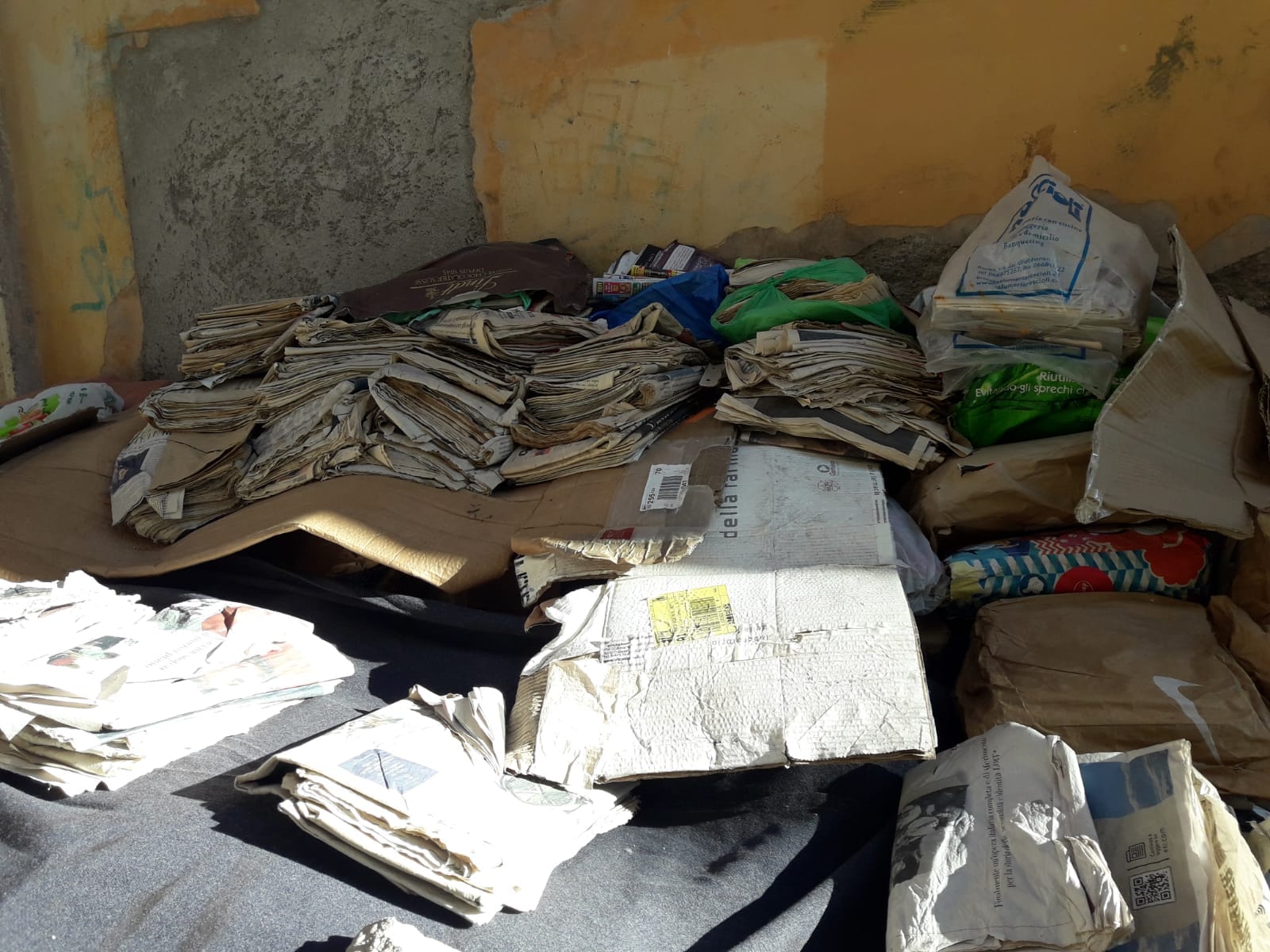 “Saranno un migliaio ed oltre di copie – scrive Conti su Il Tempo – alcune coperte da carta, altre tenute insieme, altre ancora poggiate su cartoni o raccolte in buste di plastica. Sopra un baldacchino improvvisato rivestito da teloni sdruciti con le pietre a fermare. E poi altri cartoni ripiegati sotto, bustoni pieni di ulteriori magazines e libri di vario genere accatastati in ogni angolo disponibile. Dall’oroscopo ai titoloni delle grandi testate, sbuca fuori proprio di tutto, inclusa una pagina dove si legge “Anche il bene fa notizia”. “Resta una discarica indecifrabile – prosegue l’articolo del quotidiano romano – nell’anima pulsante della città quell’enigma che blocca immancabilmente lo sguardo percorrendo il vicolo che prende il nome dal palazzo che la famiglia Delfini qui possedeva. E nessuno di coloro che abbiamo fermato per cercare di saperne di più che se la sappia spiegare. Si avanzano parecchie ipotesi”.