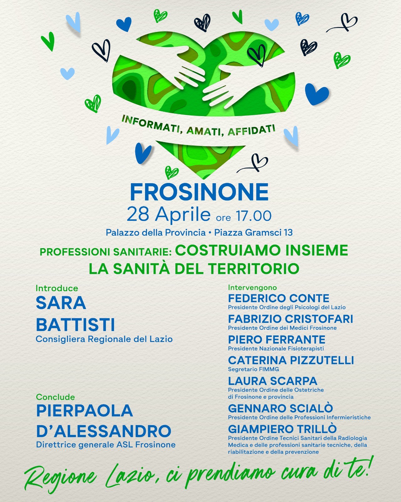 Giovedì 28 aprile, alle ore 17.00 presso il Palazzo della Provincia di Frosinone, insieme alla Battisti e alla Direttrice Generale della ASL, Pierpaola D’Alessandro, ci saranno per la prima volta tutti i referenti degli ordini medici professionali. Interverranno: il Presidente dell’Ordine degli Psicologi del Lazio, Federico Conte; il Presidente dell’Ordine dei medici di Frosinone, Fabrizio Cristofari; il Presidente Nazionale dei fisioterapisti, Piero Ferrante; il segretario FIMMG, Caterina Pizzutelli; la presidente Ordine ostetriche Frosinone, Laura Scarpa; il Presidente dell’Ordine delle Professioni Infermieristiche, Gennaro Scialò; il Presidente dell’Ordine dei Tecnici sanitari della Radiologia, Giampiero Trillò.